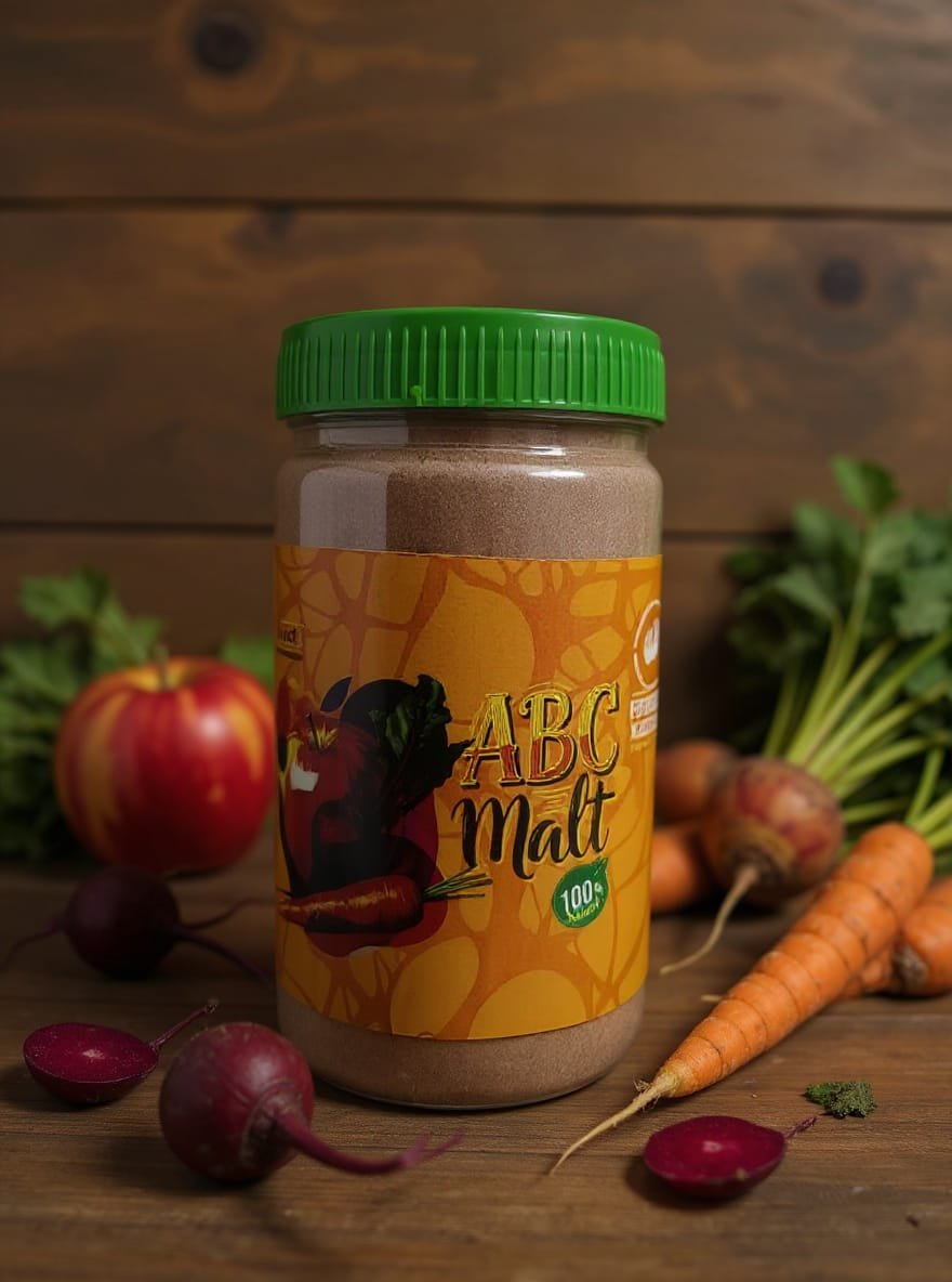 ABC Malt is a health-boosting drink made from Apple 🍎, Beetroot 🥬, and Carrot 🥕 extracts blended with herbs to improve overall wellness.